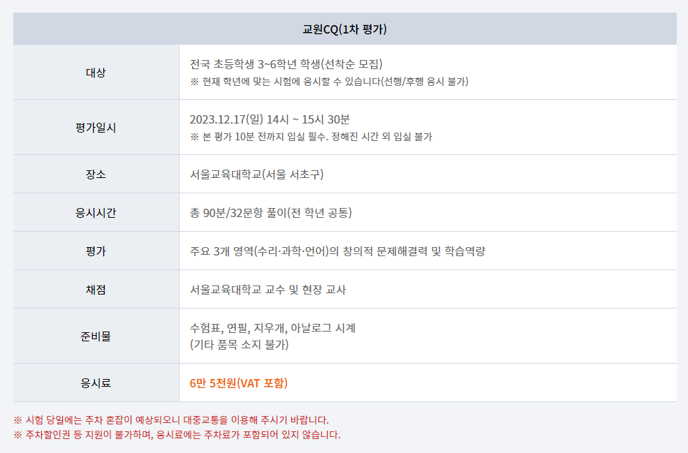 올 해로 벌써 3회를 맞이한 교원CQ 창의력 대회에서 참가 학생을 모집하고 있습니다. 얼리버드 접수 기간 연장으로 15%할인 적용된 금액으로 원서를 접수 받고 있으니 참고하여 응시 하면 좋을 것 같습니다.